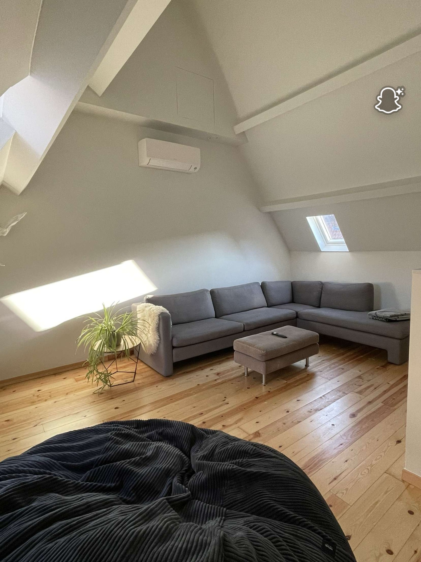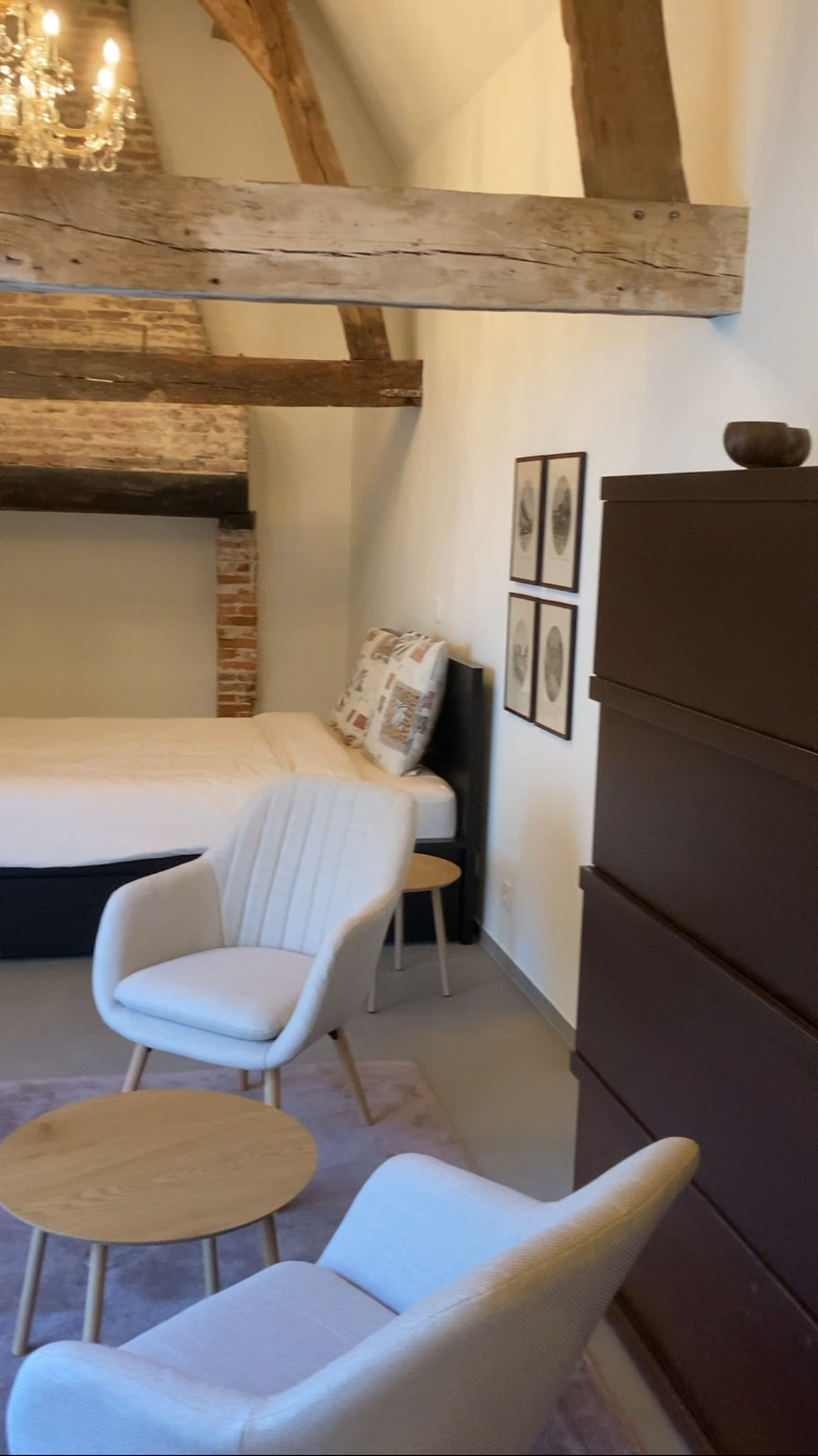 • Een ruime slaapkamer met zicht op de authentieke eiken balken van het dak – een knipoog naar de rijke geschiedenis van het begijnhof